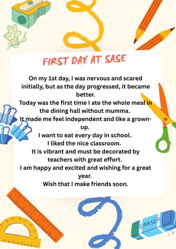The journey at SASE began with nervousness and fear on the very first day, but as the day progressed, it slowly turned into comfort and confidence. Eating a full meal in the dining hall without mamma for the first time felt like a big step toward independence. The bright, vibrant classroom and the warmth of the teachers made the experience even more welcoming.